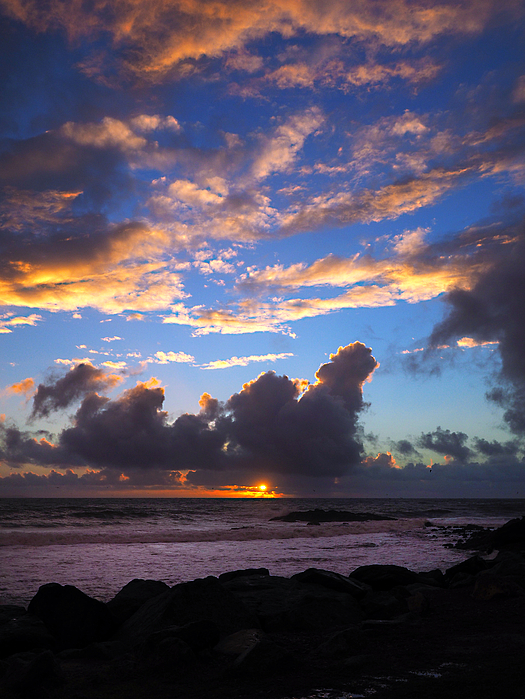 The setting sun over the Pacific reveal the glory of the passing storm, illuminating rain clouds at dusk. Sold: 4-29-17