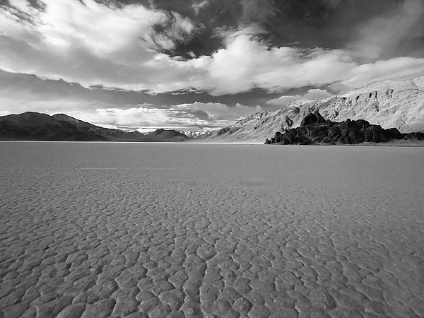 A black and white depicting a vast and remote location in Death Valley known as The Racetrack playa. This ancient dry lake bed is known for its mysterious "sliding rocks" that leave trails in the lakebed. The Nelson Range to the right, and beyond to the Inyos act as a rain curtain, leaving the location extremely dry. On rare occasion the playa will receive rain, and when it does the fine dust and minerals of the lakebed becomes very slick. Accompanying high winds are known to push stones of significant size across some distance on the slick surface.