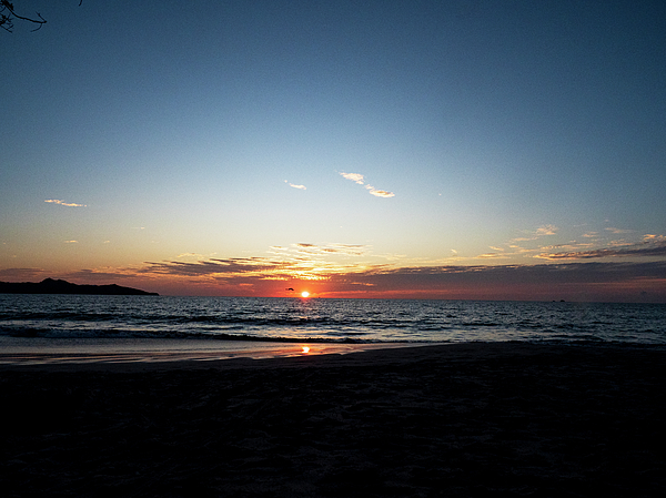 A gull in search of the days last meal as the lower arc of the sun kisses the horizon. Playa Flamingo, Costa Rica.