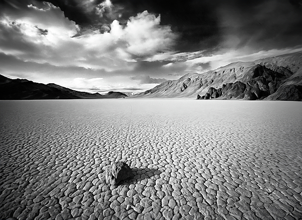 An oil effect BW image with red filter, this image was taken just after dawn at the Racetrack Playa - an ancient dry lake bed, located in a remote northwestern section of Death Valley, CA. In the foreground is an example of one of the "mysterious" sliding rocks on the playa, and the trail left behind. Far off in the distance is snow covered Mt. Hunter. Winter in DV!